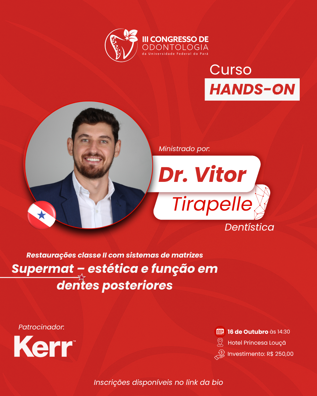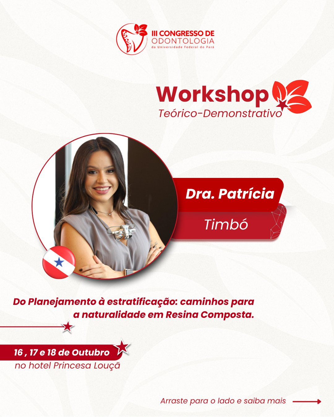 Com o tema “Do Planejamento à estratificação: caminhos para a naturalidade em Resina Composta” é ministrado pela Dra. Patrícia Timbó (@patriciatimbo_ ) o Workshop promete enriquecer ainda mais a III edição do COUFPA no dia 17 de outubro no Hotel Princesa Louçã.