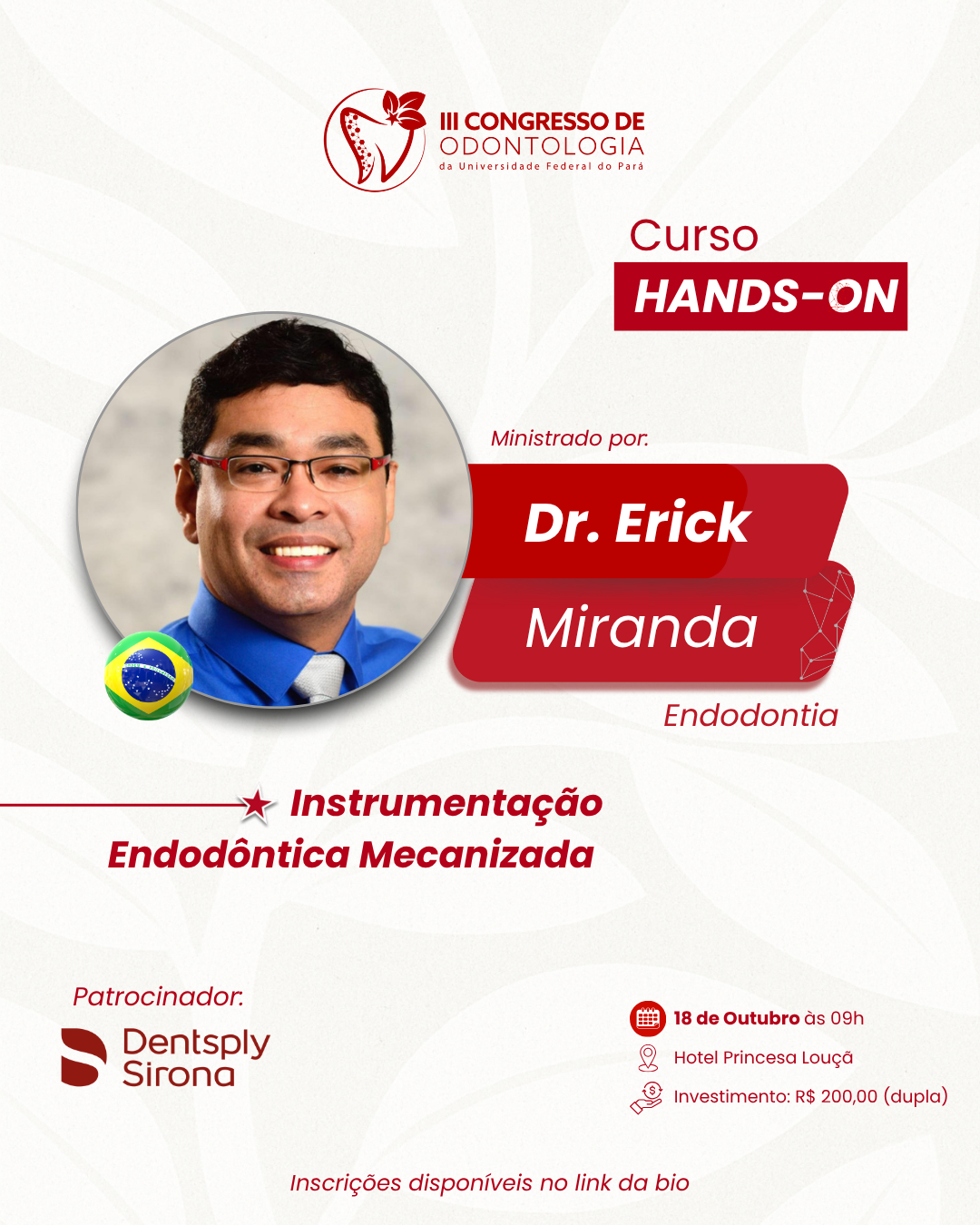 O Dr. Erick Miranda, referência em Endodontia, estará conosco ministrando o Hands-On de Instrumentação Endodôntica Mecanizada trazendo teoria e prática para você aprimorar suas habilidades clínicas.